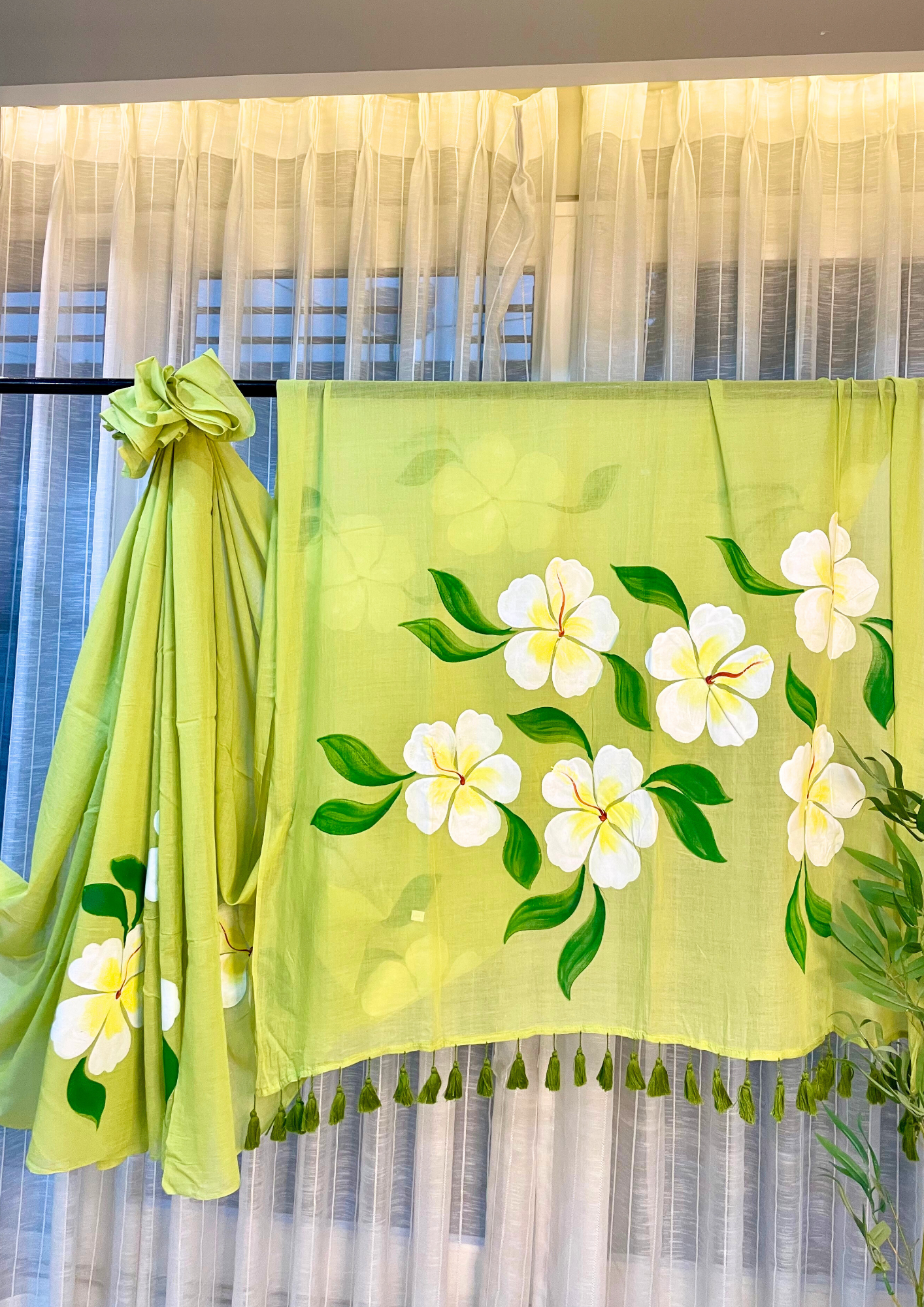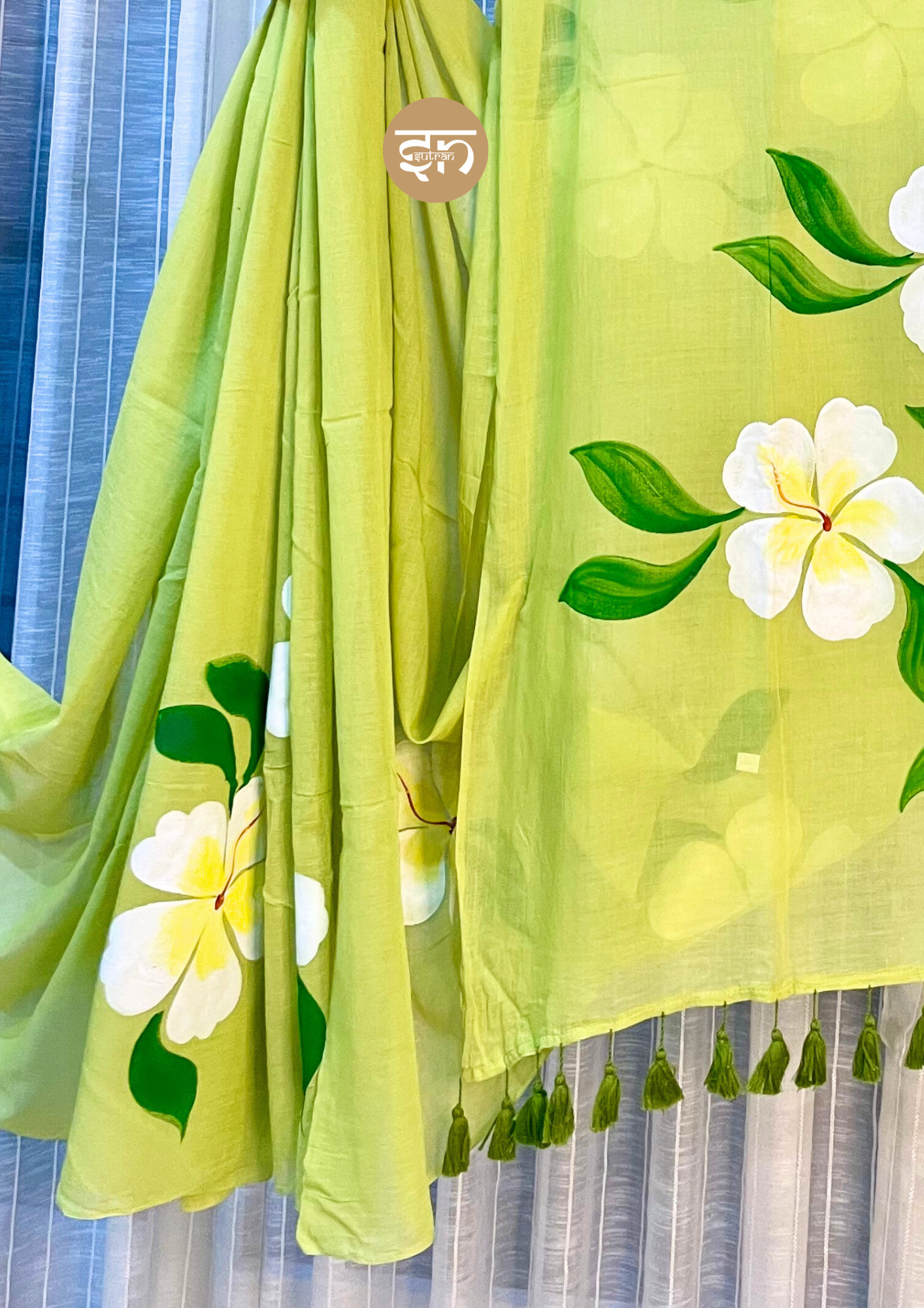 - The Ever Blooming Saree is a vision of tranquil beauty, expertly crafted from incredibly soft and breathable Mul Cotton, ensuring a delightful, feather-light feel for supreme all-day comfort. The entire body of the saree is saturated in a stunning, serene green hue, which provides a calming and elegant foundation for the exquisite artistry. This beautiful canvas is boldly adorned with large, lifelike handpainted white floral motifs, each featuring a sunny yellow center and vibrant green leaves. The unique handpainted nature of the flowers lends a truly artistic, graceful, and exclusive charm to the saree. The pallu is elegantly finished with a row of coordinating lavender tassels, adding a subtle movement and polished ethnic touch that complements the main color. Light as a breeze and wonderfully easy to drape, this saree allows for effortless elegance and flow. It is perfectly suited for breezy daytime events, relaxed social gatherings, temple visits, or tranquil occasions where you wish to blend artistry with refined comfort. The Ever Blooming Saree evokes a feeling of peaceful joy and serene confidence, allowing you to feel beautiful, delicate, and utterly poised in this timeless piece.