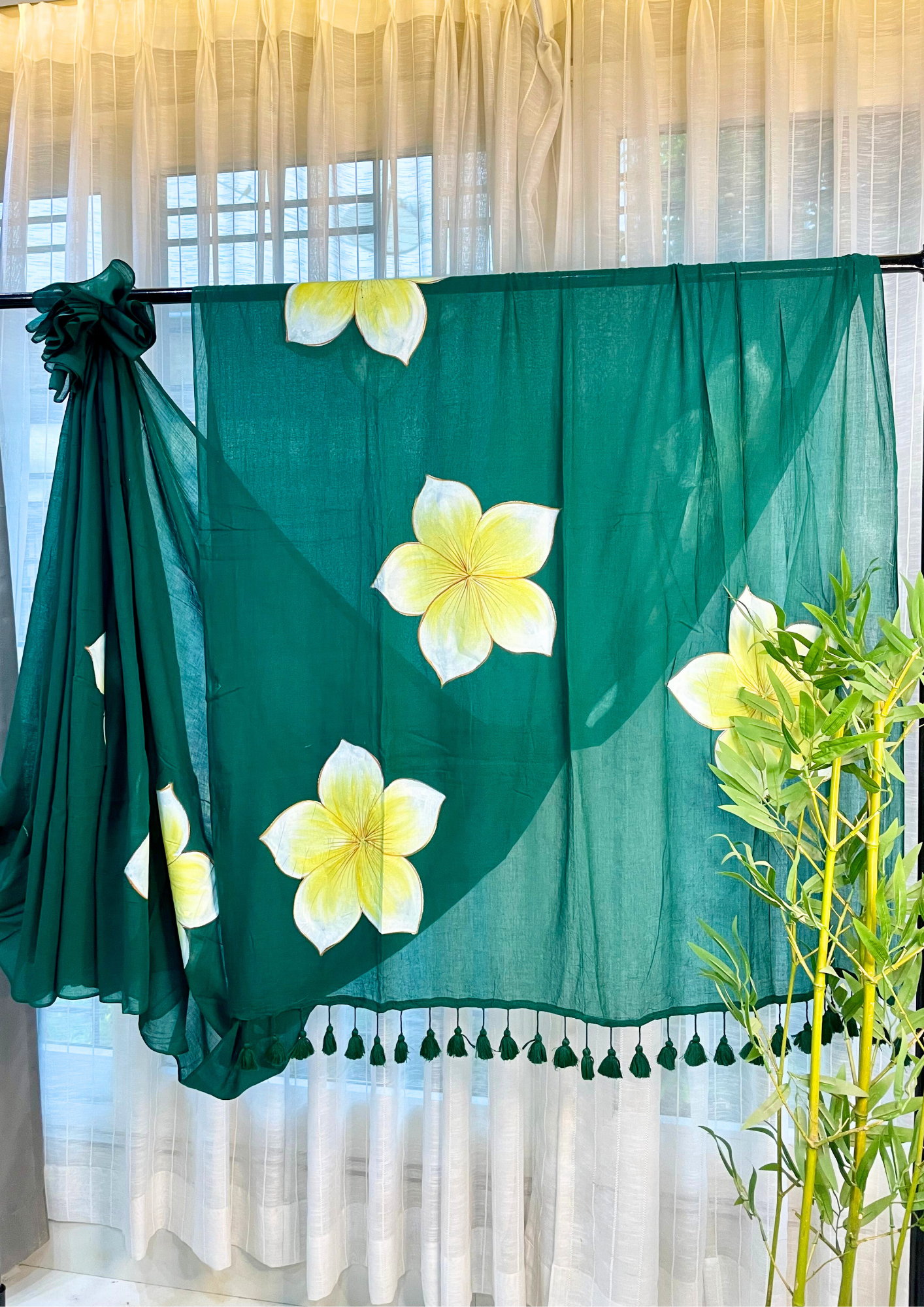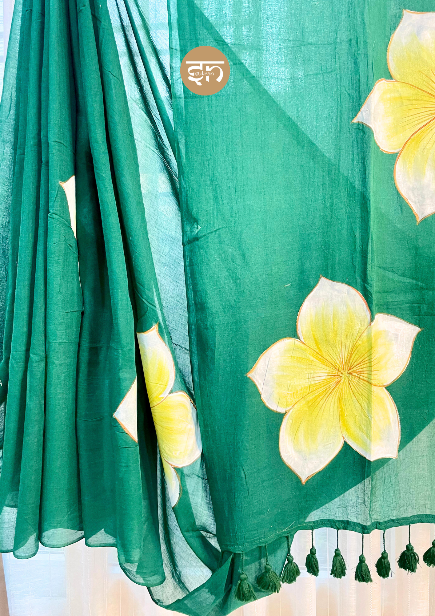 - The Ever Blooming Saree is an artistic statement, crafted from incredibly soft and breathable Mul Cotton, ensuring a delightful and lightweight feel for comfortable all-day wear. The entire body is saturated in a rich, sophisticated deep emerald green, providing a luxurious and dramatic backdrop for the exquisite artistry. This beautiful canvas is boldly adorned with large, handpainted floral motifs featuring luminous yellow and soft white petals, giving the impression of tropical blooms. The handpainted nature of the flowers lends a unique, artistic, and graceful charm to the saree, making each piece truly unique. The deep green hue, combined with the bright florals, creates a stunning and eye-catching contrast that speaks of nature and quiet elegance. The pallu is playfully finished with a row of coordinating deep green tassels, adding a subtle movement and polished ethnic touch. This saree is perfectly suited for art exhibitions, elegant garden parties, sophisticated daytime events, or tranquil occasions where you wish to blend artistry with refined comfort. The Tropicana Saree instills a feeling of rooted grace and serene confidence, allowing you to feel vibrant, beautiful, and utterly poised.