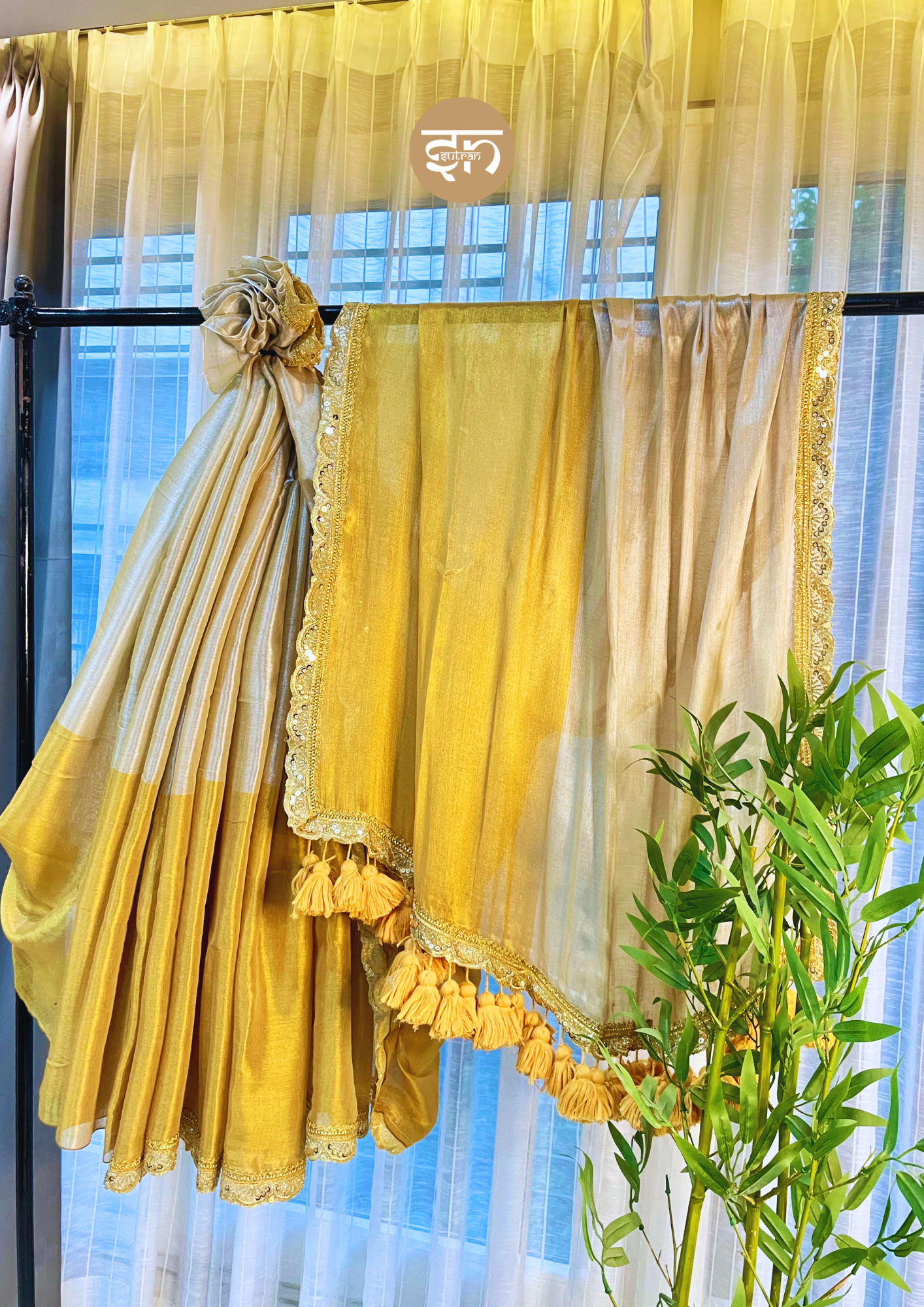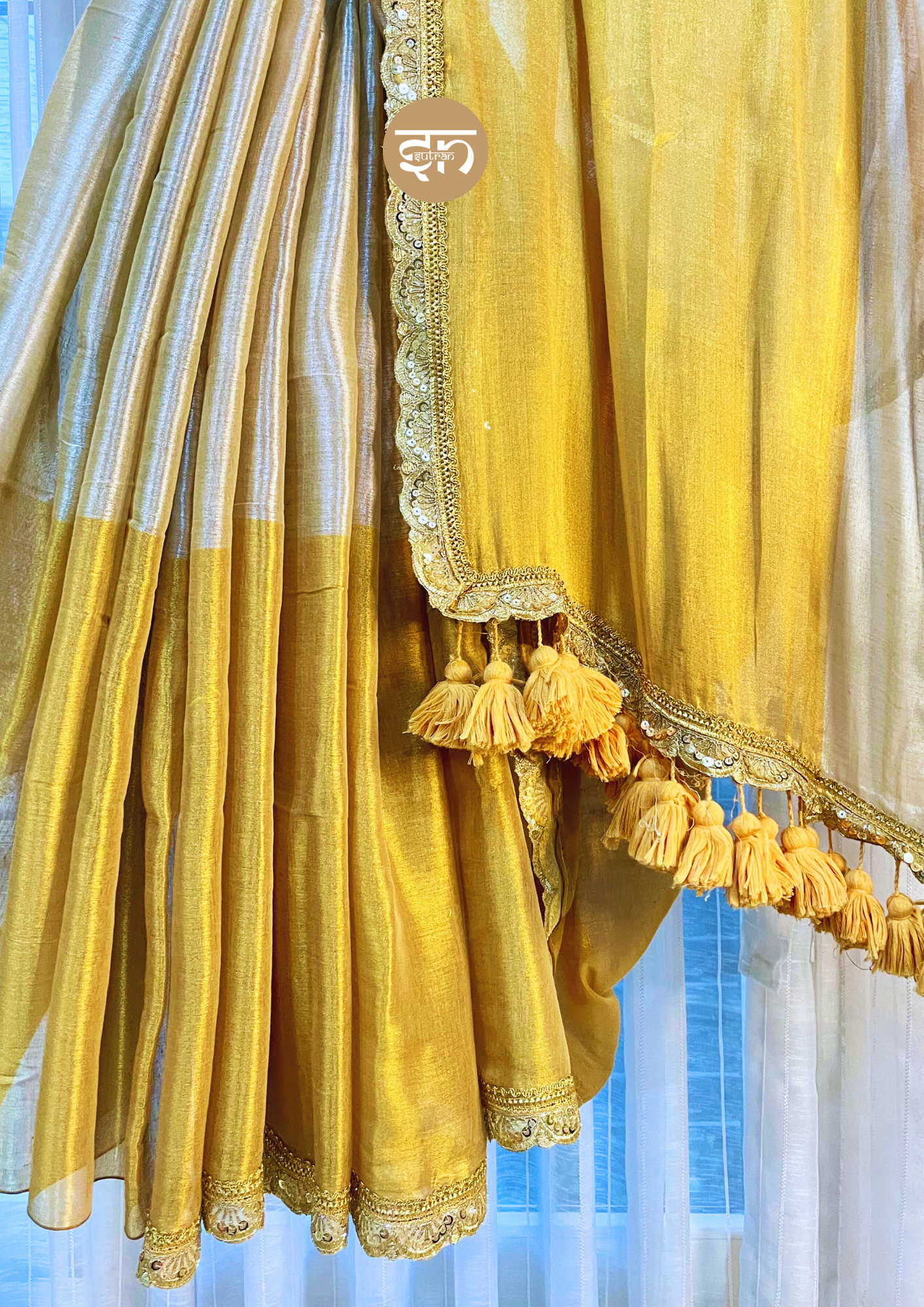 - The Sohagi Taradhuli Saree is a vision of majestic splendor, expertly crafted from a soft, luminous Tissue fabric, ensuring a luxurious drape and a breathtaking, soft sheen. The entire body of the saree showcases a rich dual-tone effect, shifting between bright golden and Beige, creating a dynamic and opulent foundation. The elegance of the body is dramatically framed by an intricate, heavy scalloped border woven entirely in brilliant golden zari, immediately lending an aura of traditional royalty. The pallu is particularly striking, featuring heavier concentration of the shimmering gold hue, and is lavishly finished with matching gold tassels, which add beautiful movement and luxurious detail. Draping with remarkable ease, this saree feels comfortably light while maintaining an undeniable aura of rich, premium, and refined sophistication. It is perfectly suited for wedding celebrations, grand evening receptions, significant festivals, or any event where a statement of classic, opulent glamour is essential. The Rupanjali Saree evokes a feeling of regal confidence and timeless grandeur, allowing you to feel beautiful, distinguished, and utterly radiant.