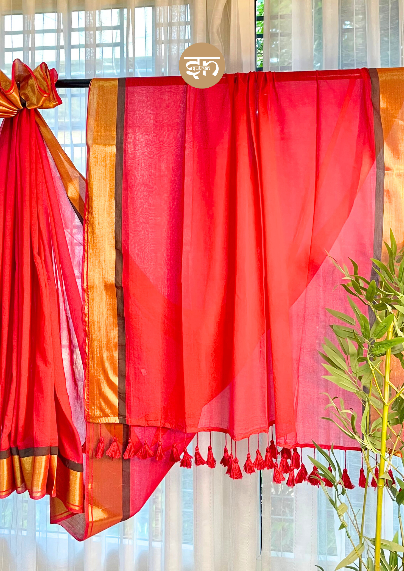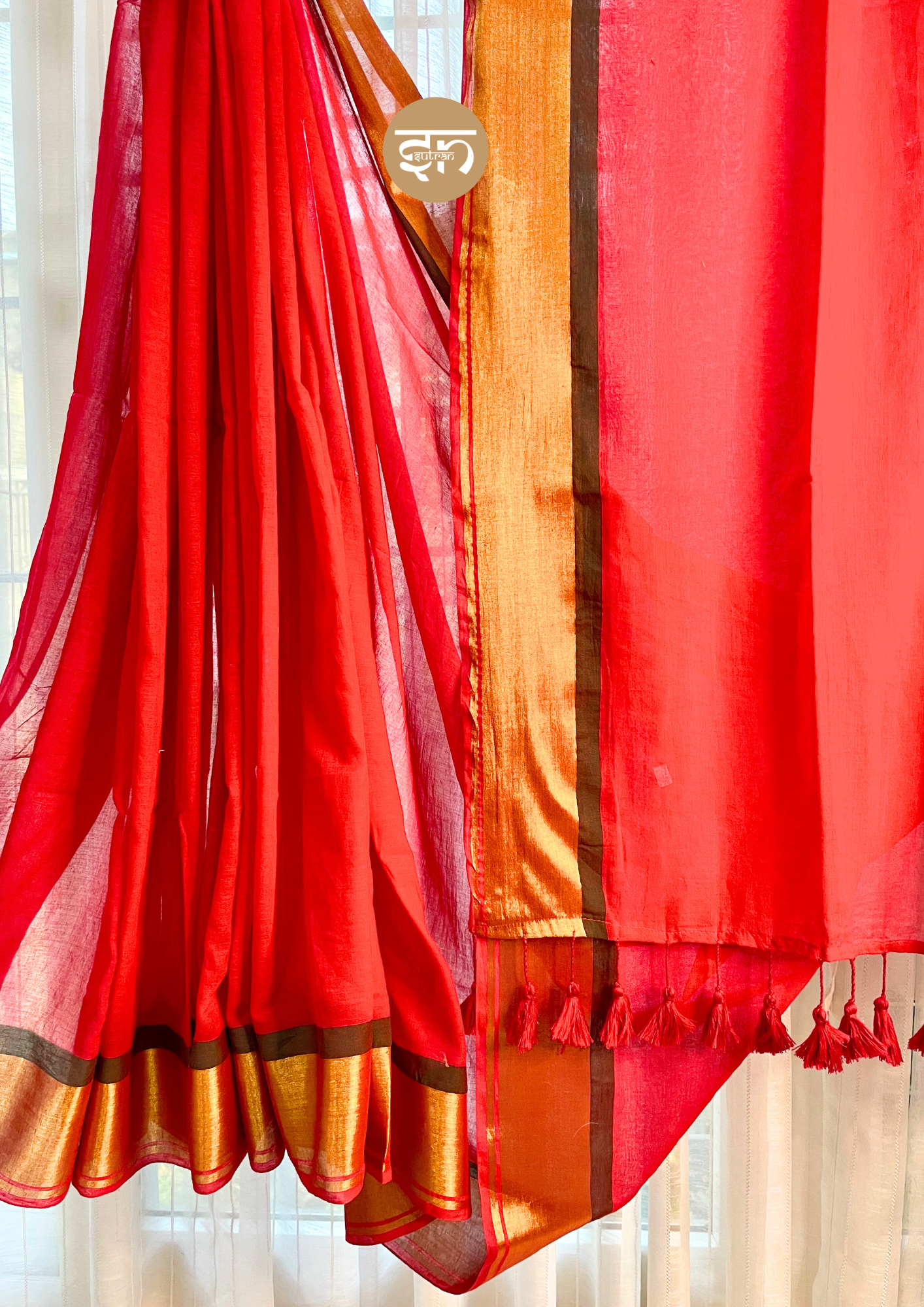 Red mul cotton saree with rich golden zari border, perfect for festive wear, weddings, and traditional occasions.