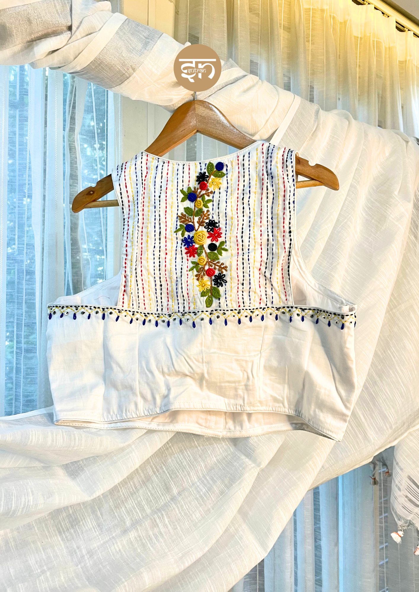Paired with a white malai cotton blouse with elegant floral embroidery.