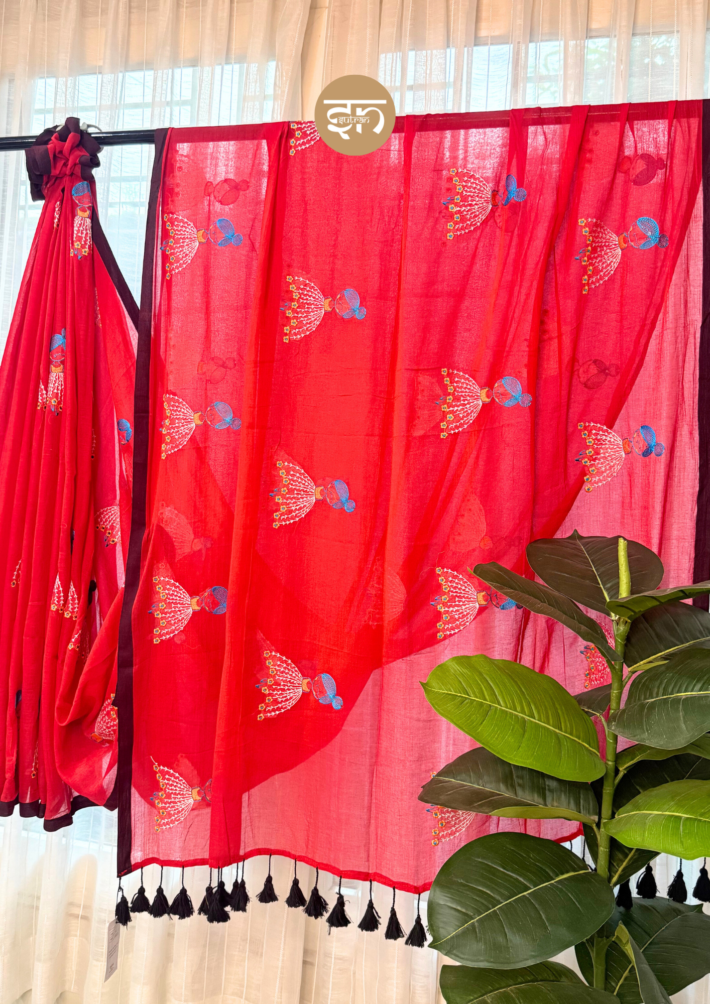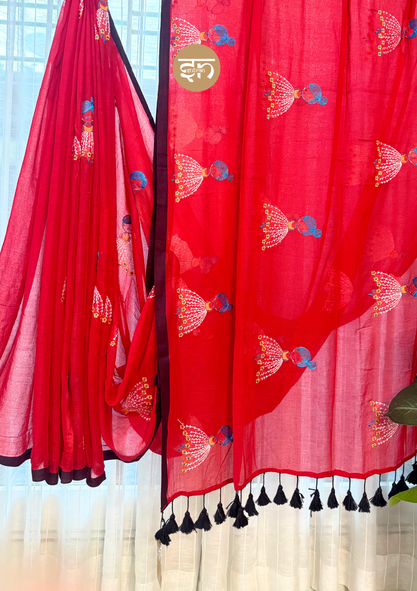Red & black mul cotton saree with playful doll embroidery design for a unique, fun look.