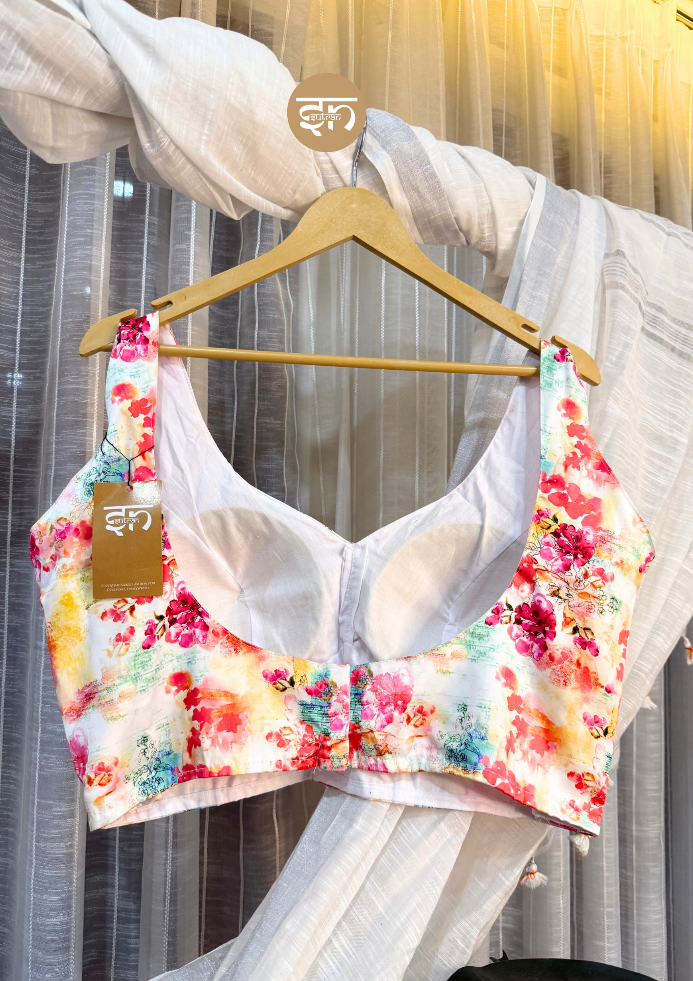 • Ignite your festive spirit with this vibrant piece from our Heart Throb Collection, designed for a captivating, joyful look. This padded blouse is crafted from luxurious silk fabric and lined with soft cotton, offering a magnificent drape and comfortable feel. The crisp white base is completely covered in a stunning all-over multicolor digital print, showcasing bold, artistic floral bursts. It features a universally flattering sweetheart neckline in the front, adding a touch of classic, romantic charm to the bold print. The chic sleeveless design is perfect for warm-weather events or for beautifully showcasing bare arms with a sheer saree. This statement blouse is an exceptional choice for Sangeet, Haldi, summer parties, and dynamic festive celebrations. The back features a stylish deep scoop open back, secured with a hook closure for a neat, confident fit. Lined with breathable cotton, the blouse ensures skin-friendly comfort, making it pleasant to wear for extended hours of celebration. The structured padding and excellent fit provide great support and a beautiful silhouette, allowing for easy, unrestricted movement. This Heart Throb blouse guarantees you will feel energized, confident, and utterly glamorous, turning heads with its stunning combination of luxury and modern print.