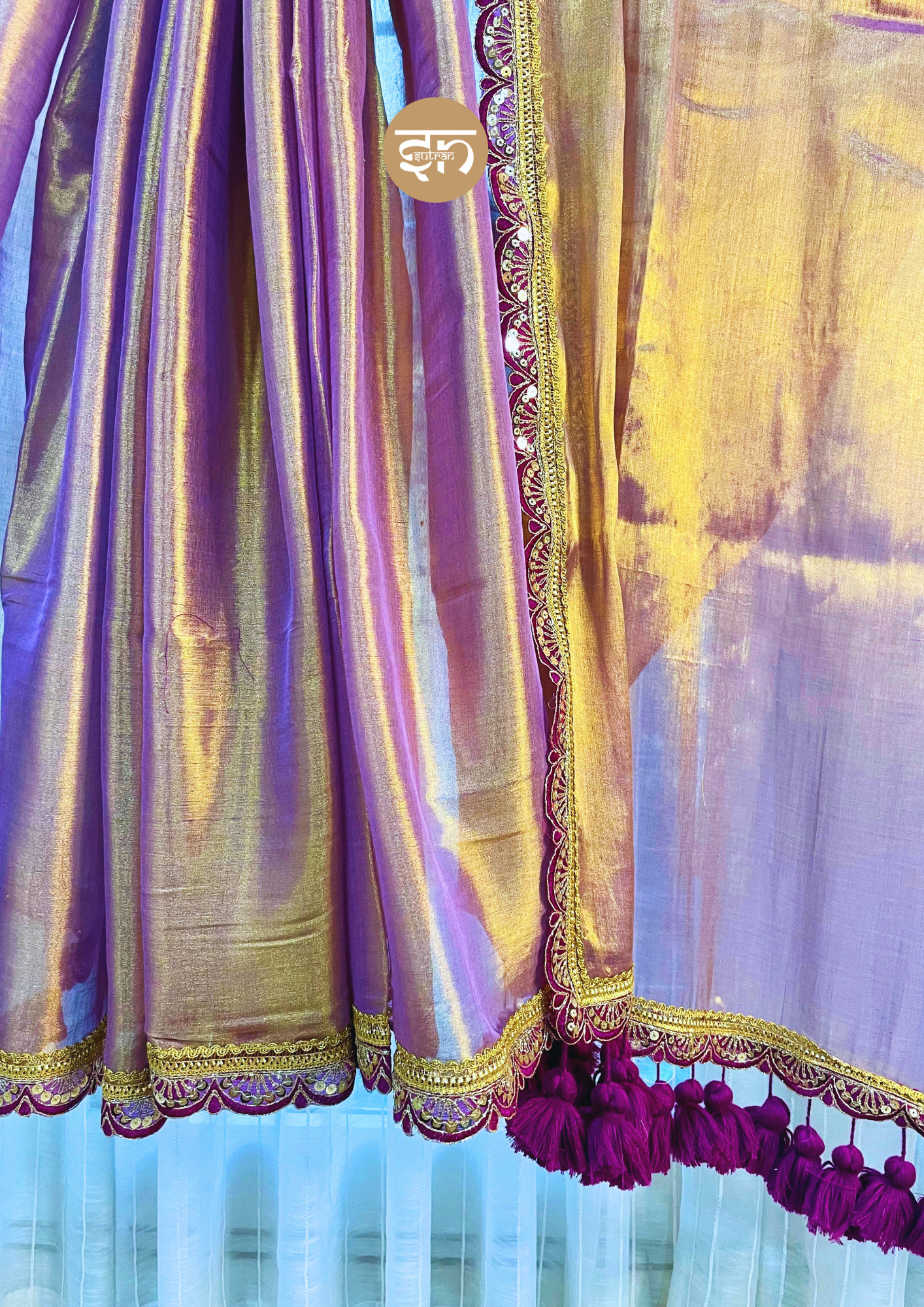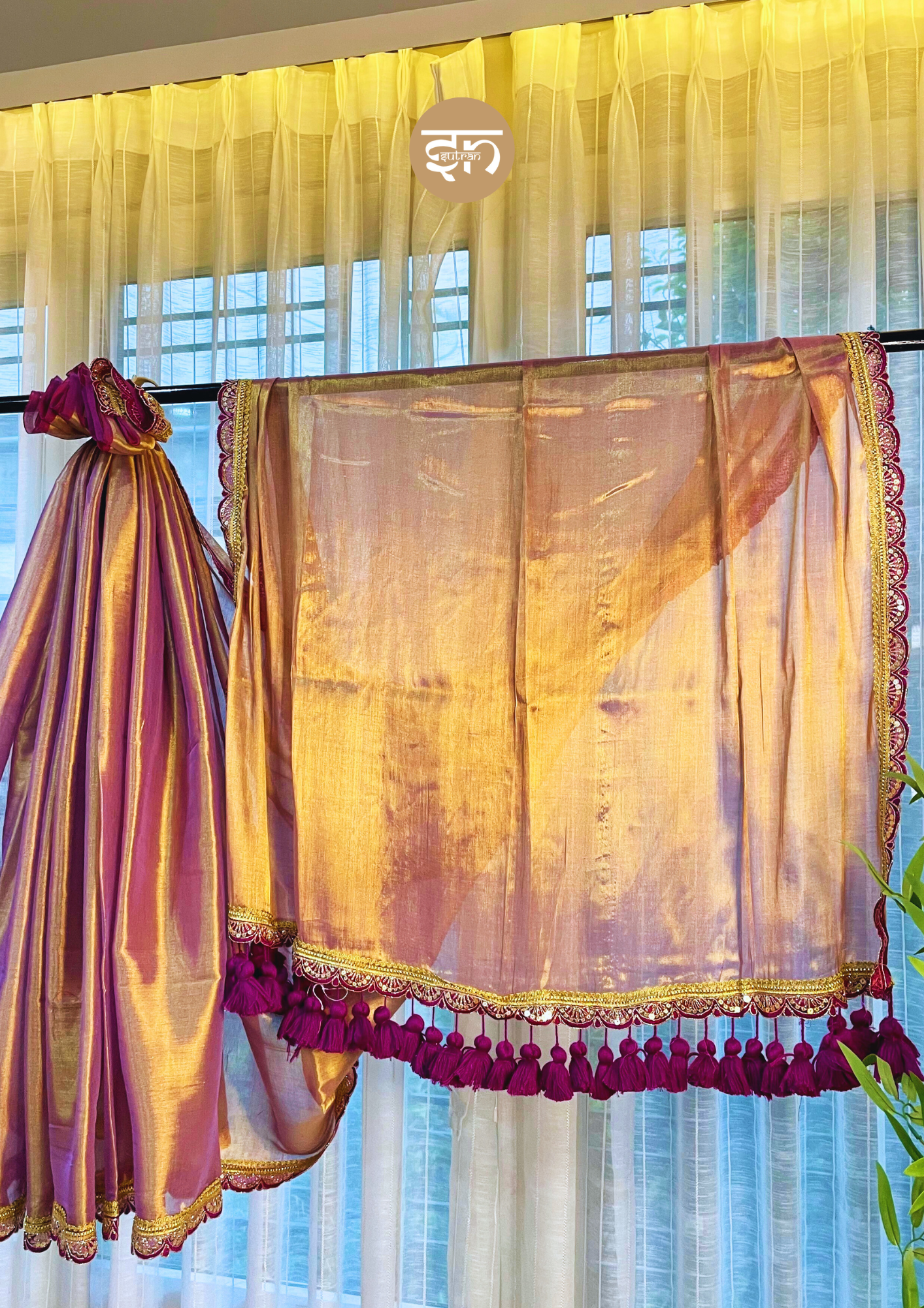 Purple & magenta dual-tone Tissue saree with luxurious zari scalloped border, perfect for weddings, festive wear, and evening occasions.