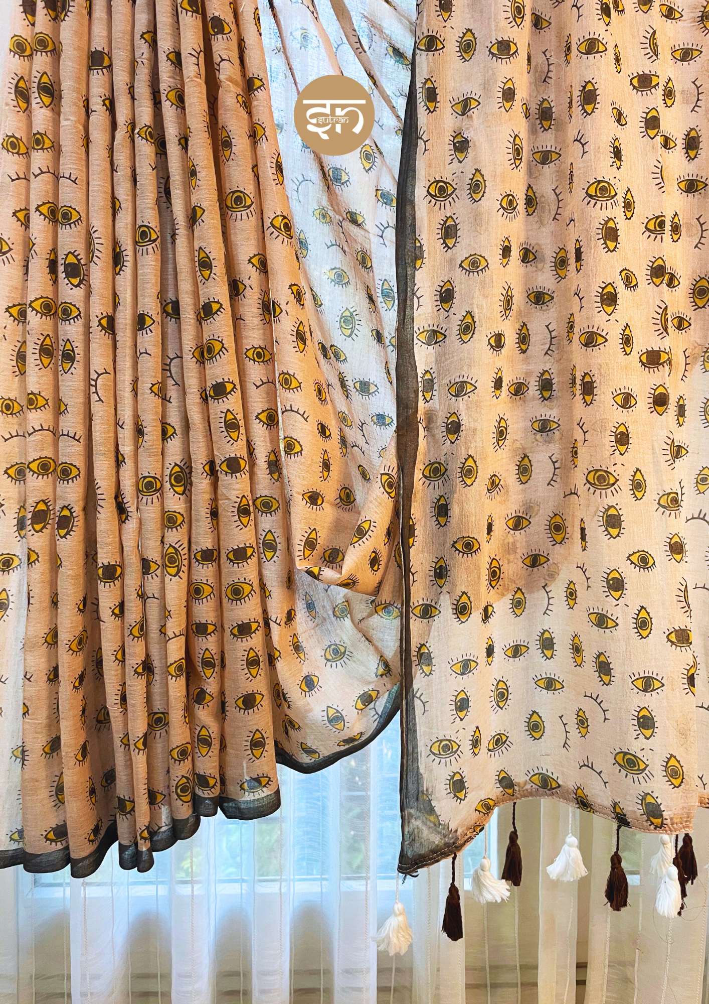 • The Drishti Saree is a captivating piece of contemporary design, expertly crafted from incredibly soft and breathable Mul Cotton, ensuring a delightful, feather-light feel for supreme all-day comfort. The entire body of the saree is saturated in a gentle beige hue, which provides a neutral, elegant, and sophisticated foundation. This subtle canvas is uniquely adorned with playful abstract eye motifs scattered densely across the fabric, executed in contrasting black and cheerful yellow print or paint. The repetitive, whimsical motifs lend a modern, artistic, and intriguing charm to the saree, making it a true conversation starter. The border is subtly defined by a thin deep grey edge, which provides a polished frame for the main body’s color and pattern. The pallu is playfully finished with a mix of coordinating white and black tassels, introducing a subtle movement and polished ethnic touch. Light as a breeze and wonderfully easy to drape, this saree allows for effortless elegance and flow. It is perfectly suited for art events, casual get-togethers, modern social gatherings, or any celebration where you wish to express a unique, artistic sense of style. The Drishti Saree evokes a feeling of fresh individuality and poised confidence, allowing you to feel beautiful, distinct, and utterly chic in this gorgeous, contemporary piece.