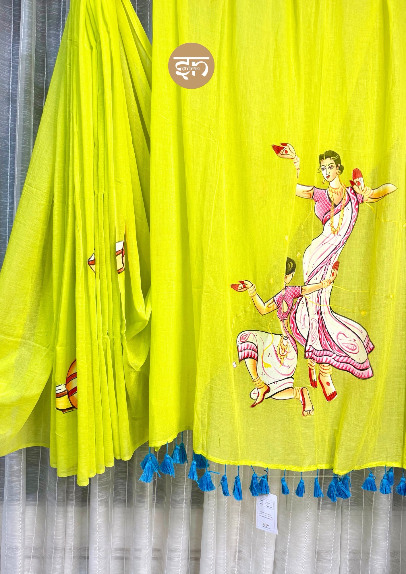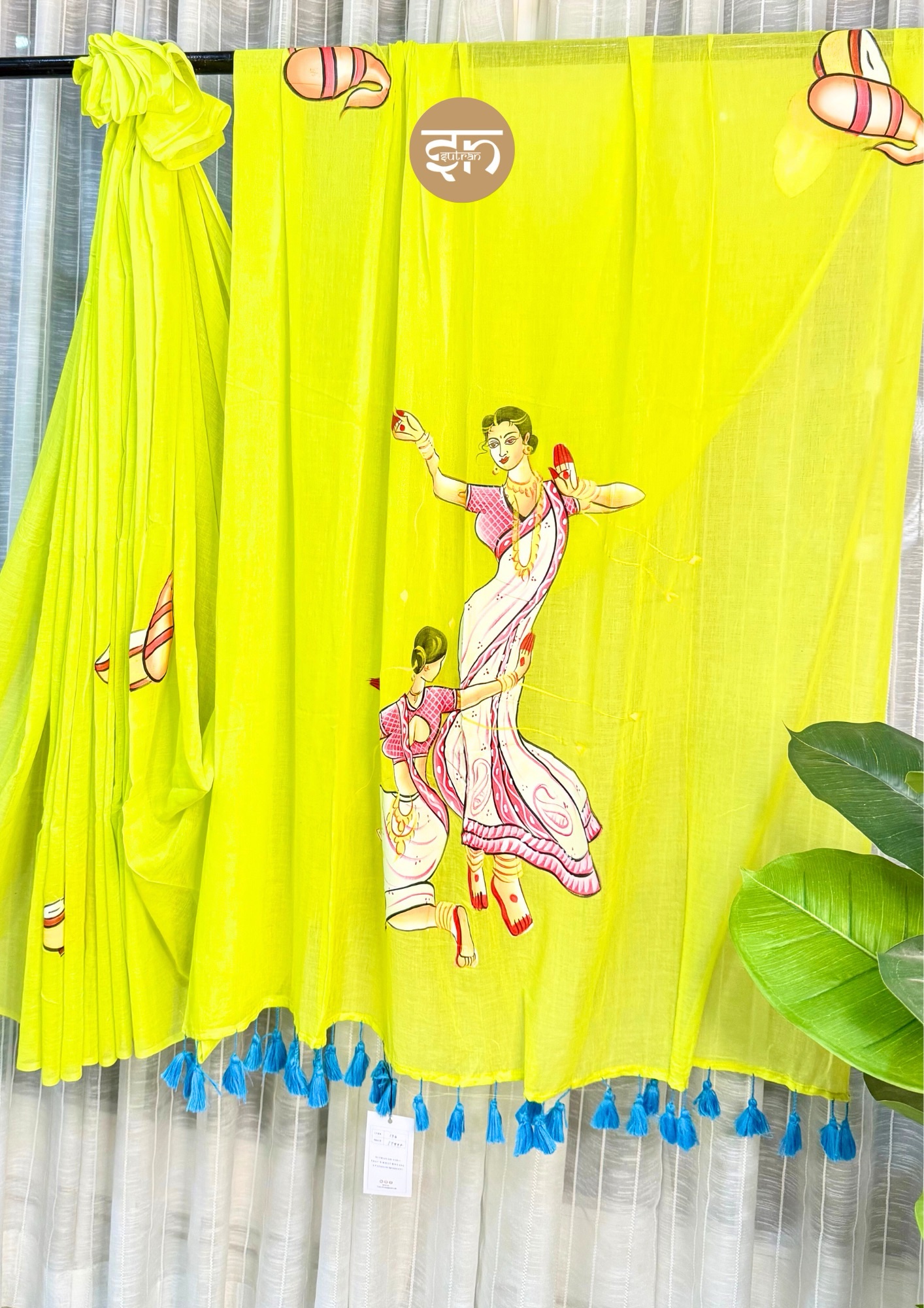 • The Dola Re saree is beautifully crafted from wonderfully soft, breathable Mul Cotton, ensuring the fabric is exceptionally light, comfortable, and supremely gentle against the skin. The base color is a vibrant and cheerful lime green, which provides a lively and refreshing canvas for the intricate artistry. The entire saree is gracefully covered in delicate hand-painted motifs, which create a beautiful texture and flow across the drape. The magnificent pallu is the focal point, featuring a striking traditional portrait of dancing girls rendered in vibrant multicolors, adding immense cultural richness. The overall design is completed with charming blue pompoms placed along the edges, successfully blending traditional art with a delightful, playful touch. This piece is perfect for joyous and significant occasions, including festive gatherings, peaceful temple visits, puja ceremonies, Durga Puja celebrations, or any special event where tradition meets contemporary elegance. The Dola Re is a saree that does far more than just dress you—it unfolds a captivating story with every graceful fold. Wear it, and you will carry a beautiful piece of celebration and heritage wherever your journey takes you.