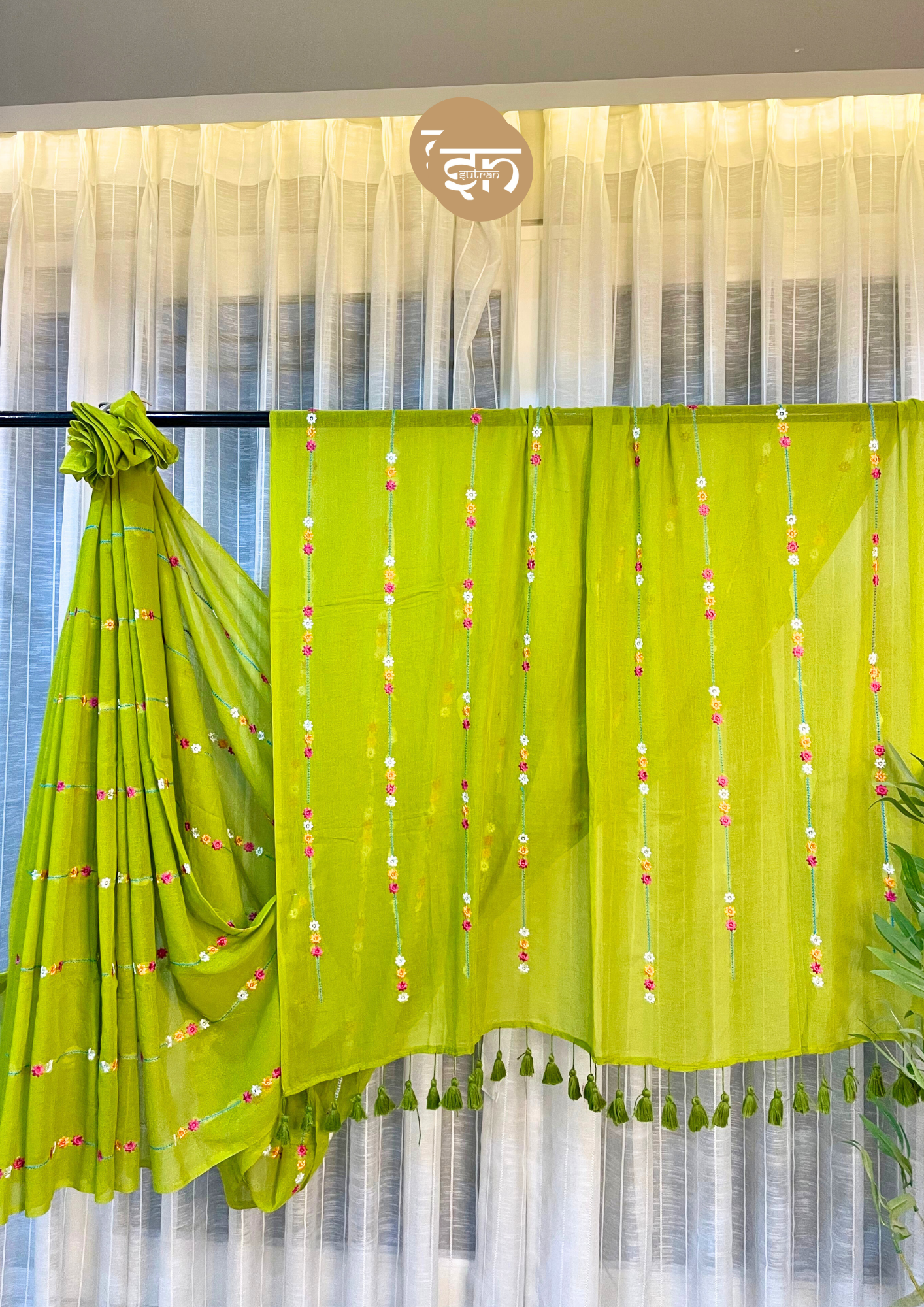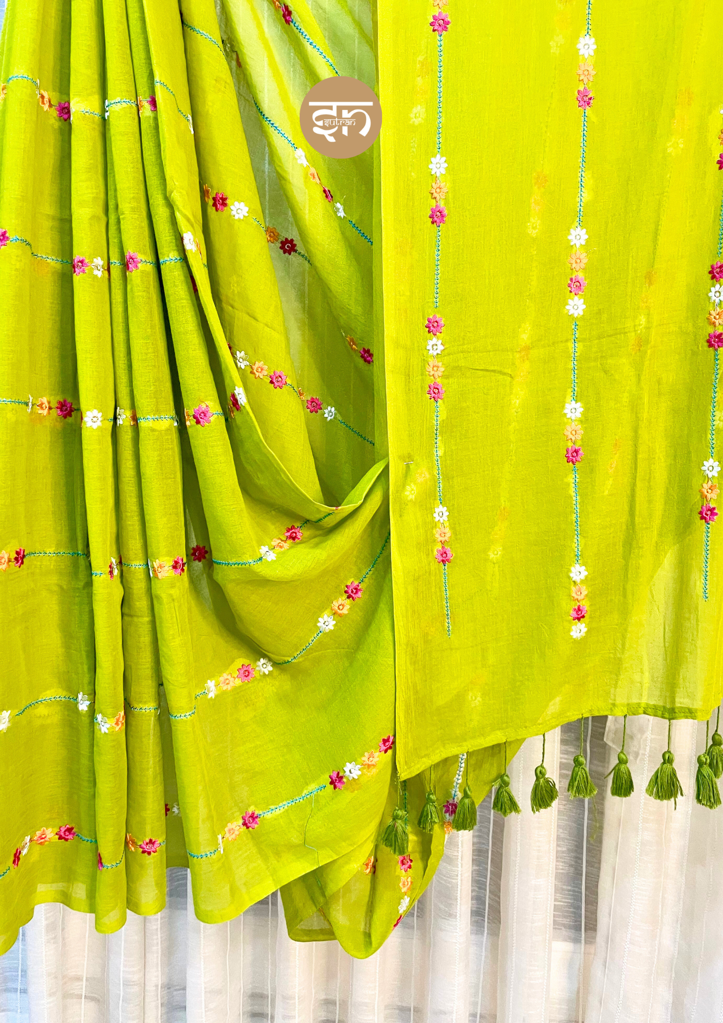 Green Mul Cotton saree featuring delicate chain embroidery and floral motifs for a fresh, breathable summer look.