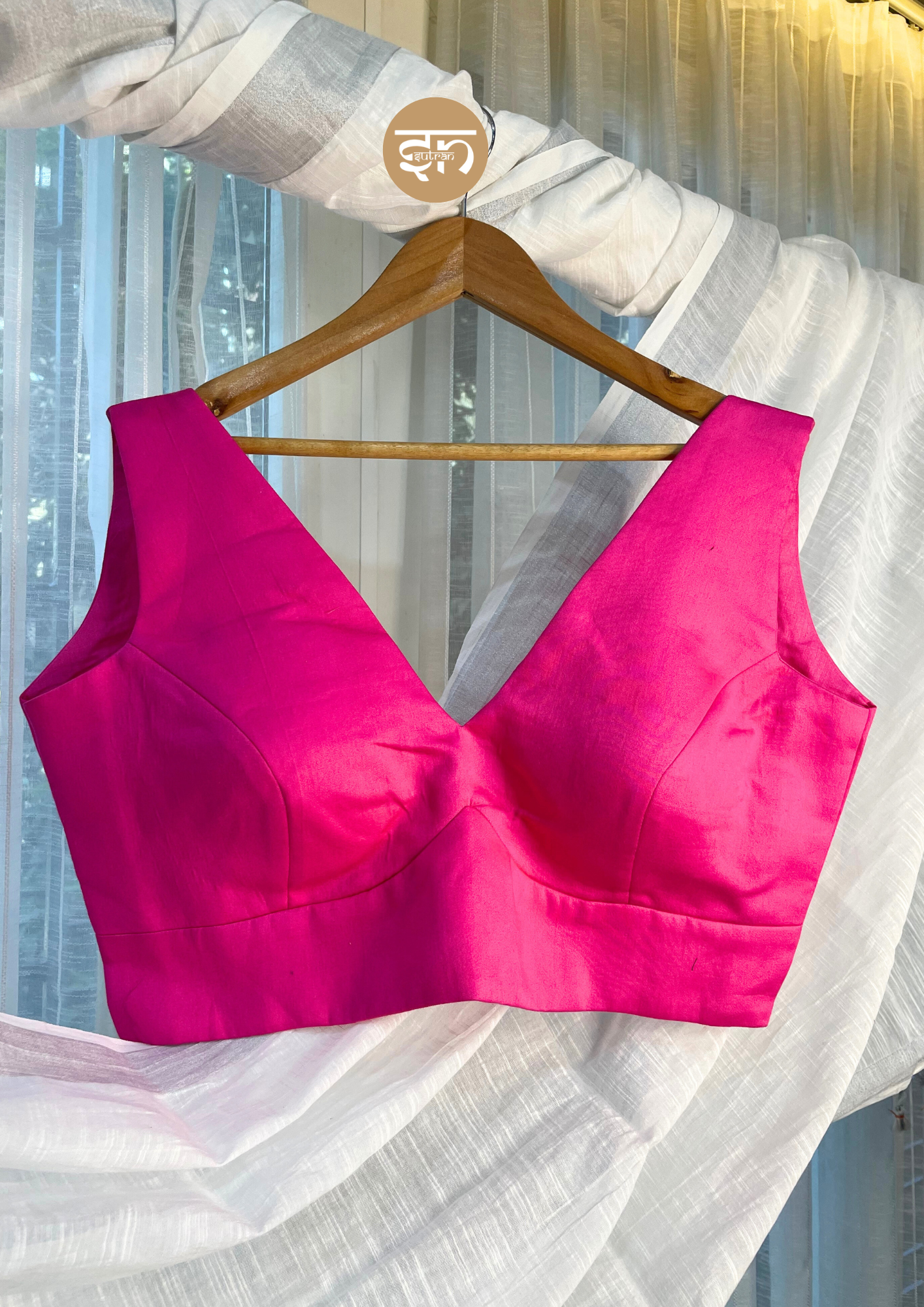Paired with a fuchsia butter silk blouse, padded and designed for a flattering fit.