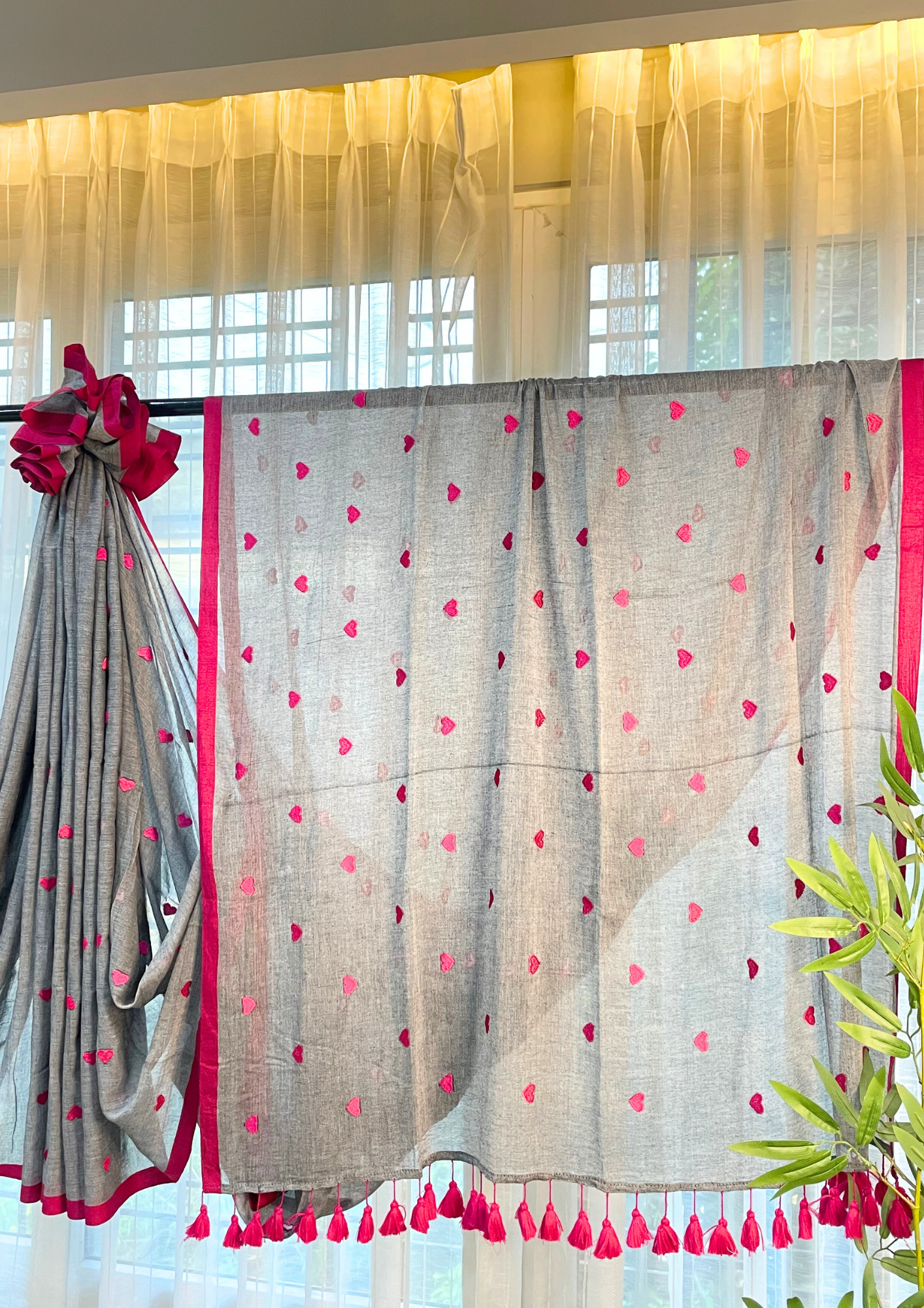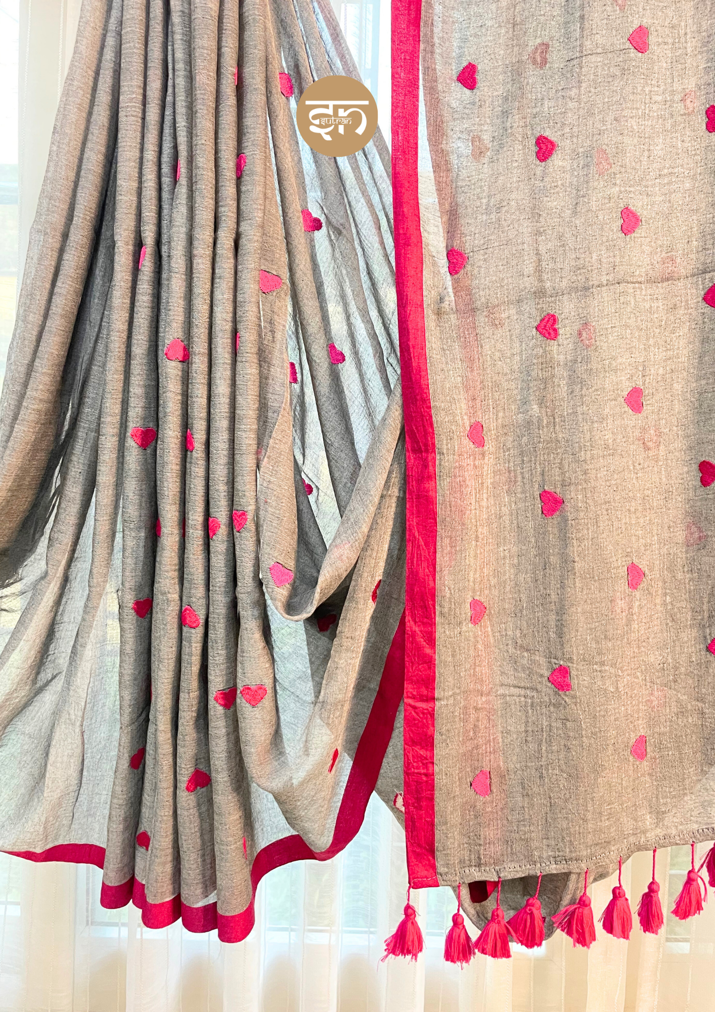 Grey & pink mul cotton saree with delicate heart embroidery, soft summer saree perfect for daily wear. Lightweight, breathable, and easy drape saree ideal for hot weather and all-day comfort.