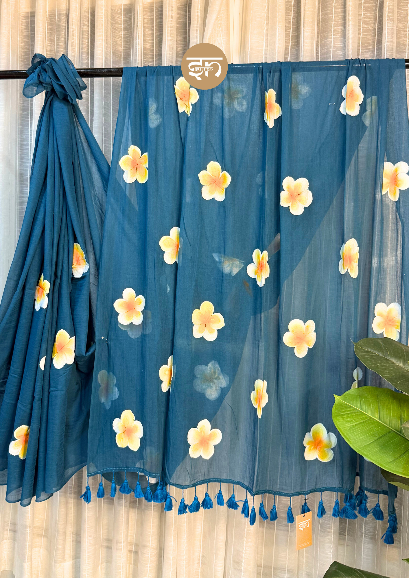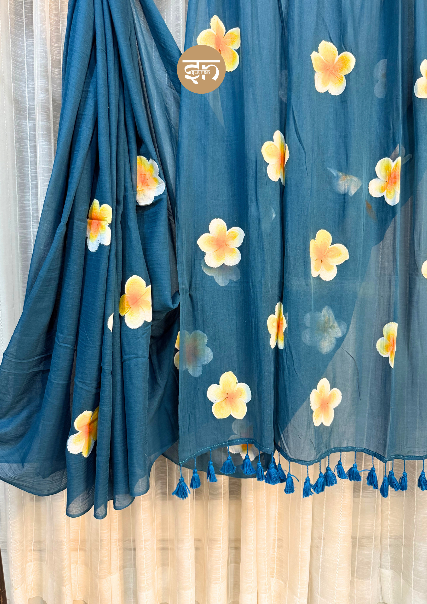- The Ever Blooming saree is expertly woven from soft, breathable Mul Cotton, ensuring the fabric is delightfully light, airy, and exceptionally gentle against the skin for ultimate comfort. The base color is a beautiful, serene teal blue, which provides a refreshing and sophisticated canvas for the artistic detailing. The saree is gracefully adorned with stunning hand-painted flowers, with a particular focus along the flowing pallu, which collectively imparts a soothing and wonderfully fresh vibe. Each individual flower is carefully painted in calming shades, allowing the design to stand out beautifully without ever appearing loud or overwhelming. The visible brush strokes lend the saree a unique, graceful, and appealingly handmade charm, showcasing true artistry. The overall design is completed with delicate blue pompoms along the edges, creating a perfect blend of peaceful calm and subtle, feminine charm. This piece is ideally suited for moments like breezy mornings, relaxed social get-togethers, or simply unwinding in sophisticated style. The Ever Blooming truly is a saree that feels like a quiet, gentle breeze to wear, yet possesses an elegant presence that is entirely unforgettable.