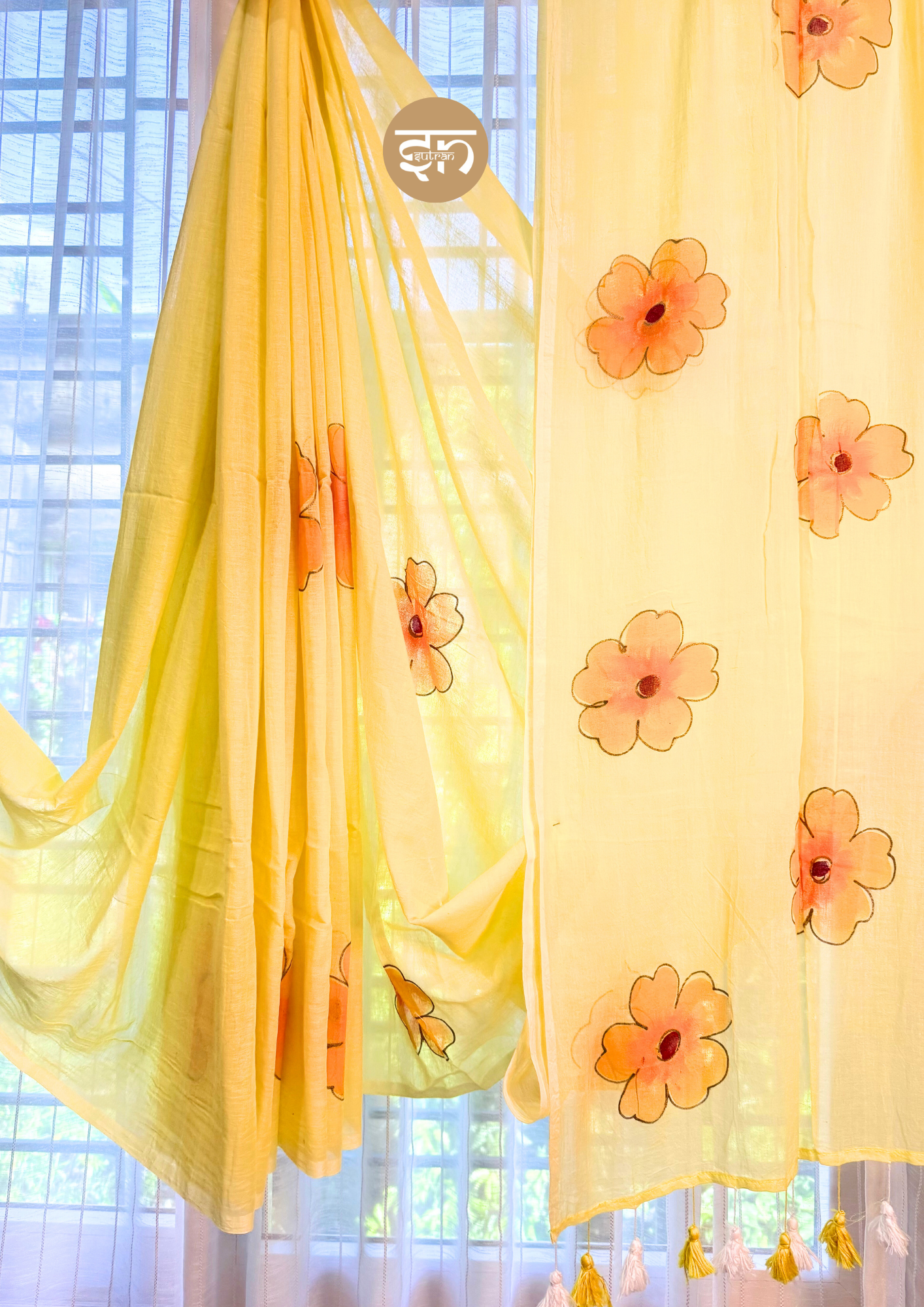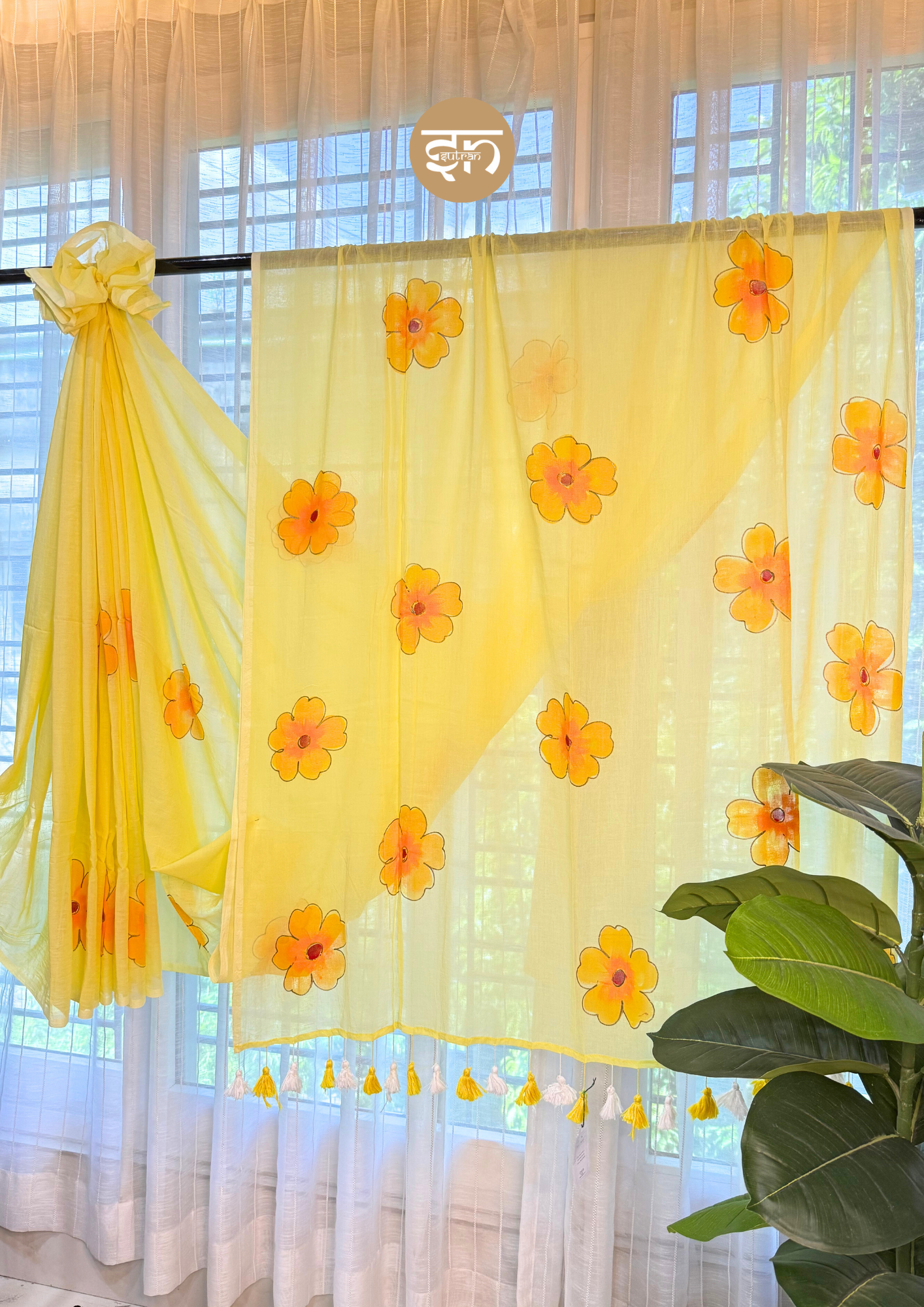 - The Ever Blooming saree is expertly woven from soft, breathable Mul Cotton, ensuring the fabric is delightfully light, airy, and exceptionally gentle against the skin for ultimate comfort. The base color is a cheerful and bright yellow, which provides a beautiful, sunny canvas for the artistic detailing. The saree is gracefully adorned with stunning hand-painted flowers, with a particular focus along the flowing pallu, which collectively imparts a soothing and wonderfully fresh vibe. Each individual flower is carefully painted in calming shades, allowing the design to stand out beautifully without ever appearing loud or overwhelming. The visible brush strokes lend the saree a unique, graceful, and appealingly handmade charm, showcasing true artistry. The overall design is completed with delicate blue pompoms along the edges, creating a perfect blend of peaceful calm and subtle, feminine charm. This piece is ideally suited for moments like breezy mornings, relaxed social get-togethers, or simply unwinding in sophisticated style. The Ever Blooming truly is a saree that feels like a quiet, gentle breeze to wear, yet possesses an elegant presence that is entirely unforgettable.