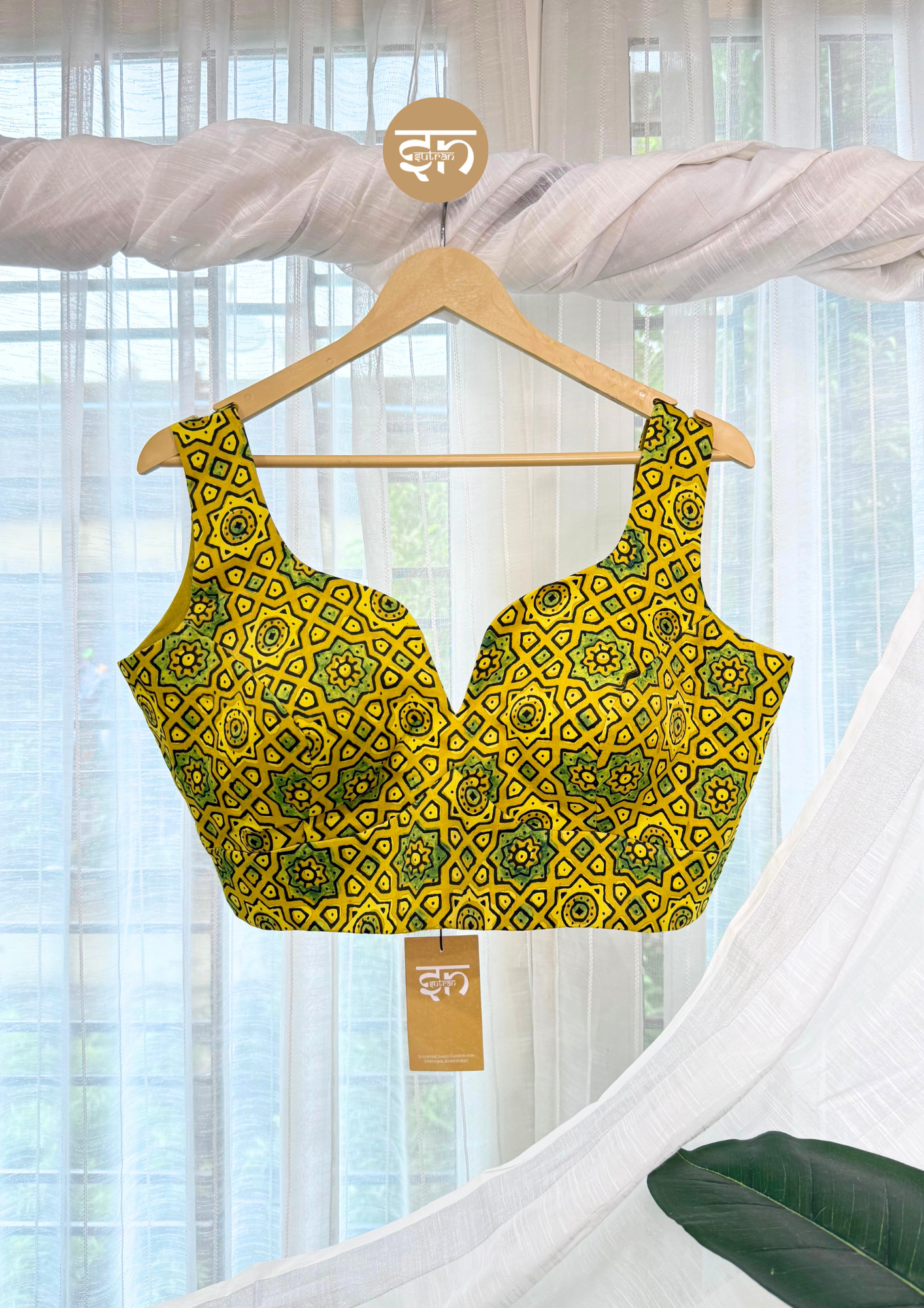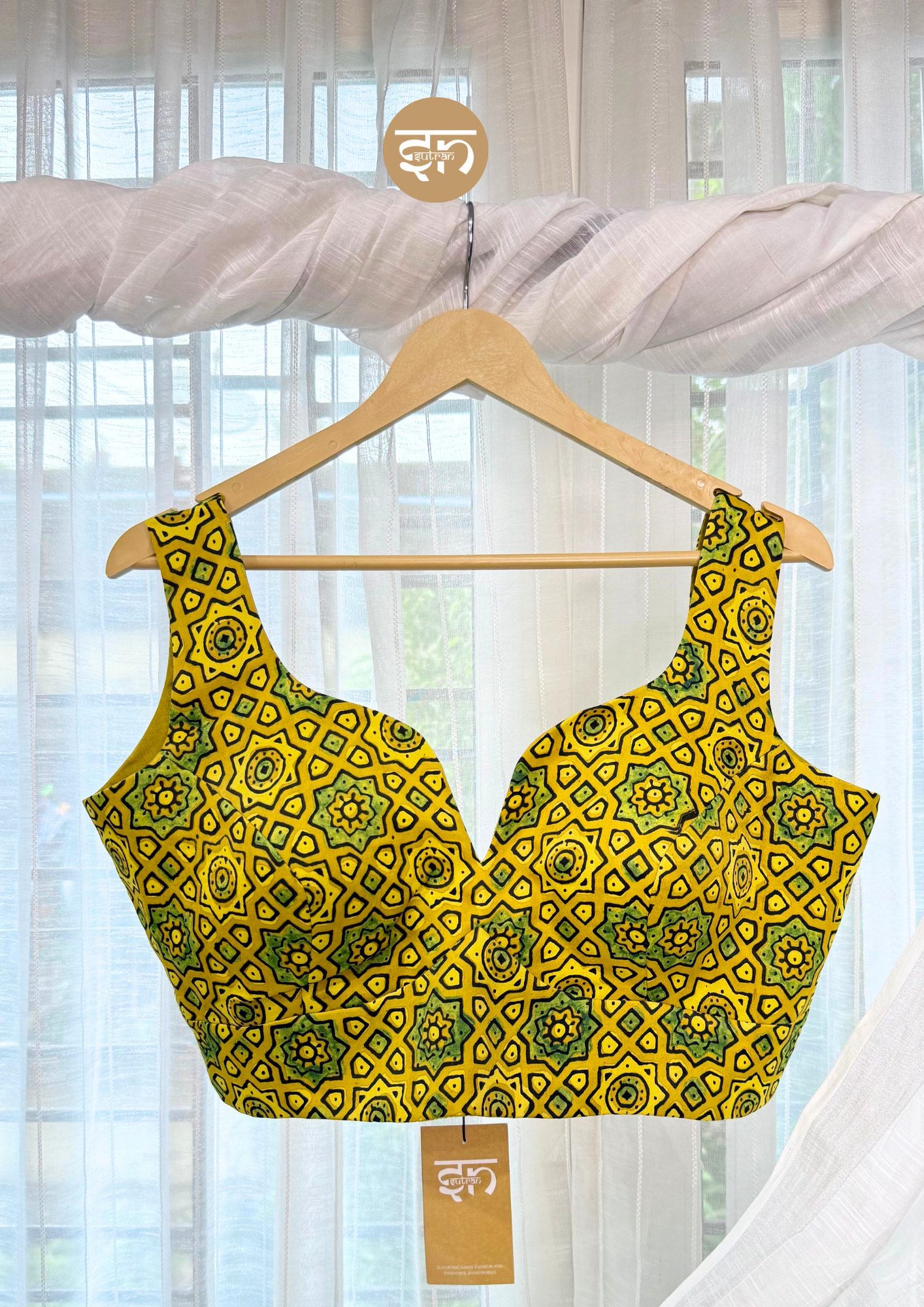 - From the Makhmal Ajrakh collection, this Yellow Malai Cotton Blouse is crafted from soft, smooth modal silk that feels light and luxurious on the skin. It features striking green-yellow contrast Ajrakh work, adding an artisanal, vibrant charm to the design. Comfortable and easy to wear, it drapes gracefully and allows effortless movement, making it perfect for daily wear, festive occasions or gatherings. The sleeveless design and sweetheart neckline provide a chic, contemporary silhouette. Elegant yet bold, this blouse enhances your outfit with a sophisticated flair, giving you the confidence to stand out and shine with style. A timeless piece that blends tradition with contemporary elegance, it’s designed to make you feel radiant every day. The Malai Cotton fabric ensures a comfortable fit even during prolonged wear. The bold pattern and vibrant color make it an instant statement piece. The back hook opening ensures a neat and secure fit. This beautiful blouse is a perfect addition for anyone seeking comfort combined with rich, traditional artistry.