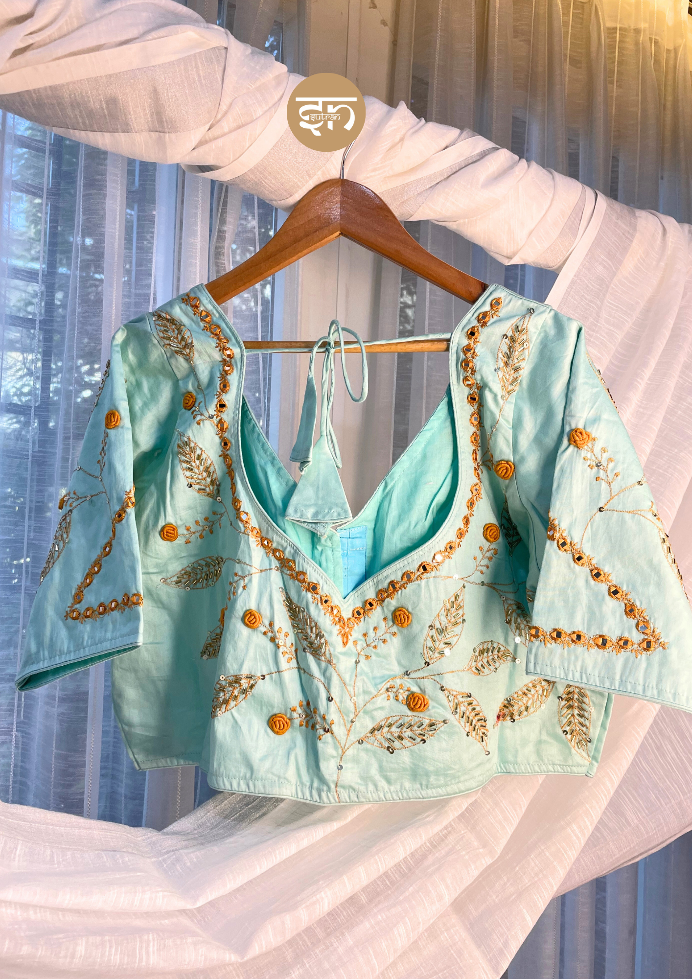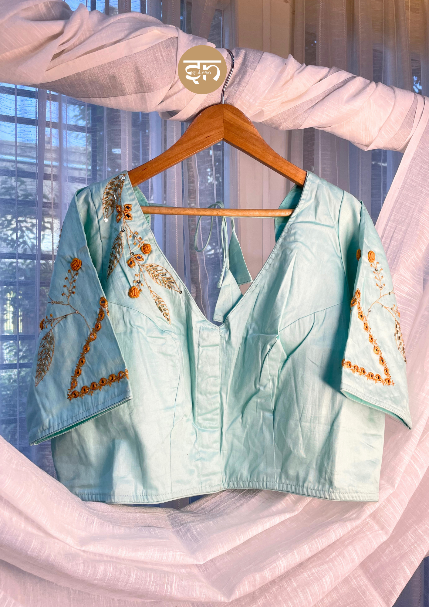 - From the Mayur Collection, this gorgeous Sky Blue Blouse is crafted from soft, smooth butter silk that feels gentle and luxurious on the skin. Adorned with delicate golden zari leaf patterns, shimmering sequins, and 3D floral accents, it is exceptionally light and comfortable. Elegant in design, it features a sophisticated V-neck front and a deep V-back with a delicate tie-up dori detail, bringing a touch of sophistication to any outfit—perfect for weddings, parties, or special celebrations. The smooth butter silk ensures that the blouse is luxurious yet breathable, prioritizing your comfort. The elbow-length sleeves and clean lines provide a contemporary look while the detailed embroidery offers traditional richness. Wearing it boosts your confidence, letting you shine gracefully and stand out without trying too hard. The tailored fit and padded front ensure a flattering silhouette that stays comfortable during long events. The versatile pastel blue color makes it highly adaptable for pairing with different sarees, from vibrant silks to minimal organzas. Ultimately, this blouse offers the perfect marriage of rich festive appeal and luxurious daily wearability.
