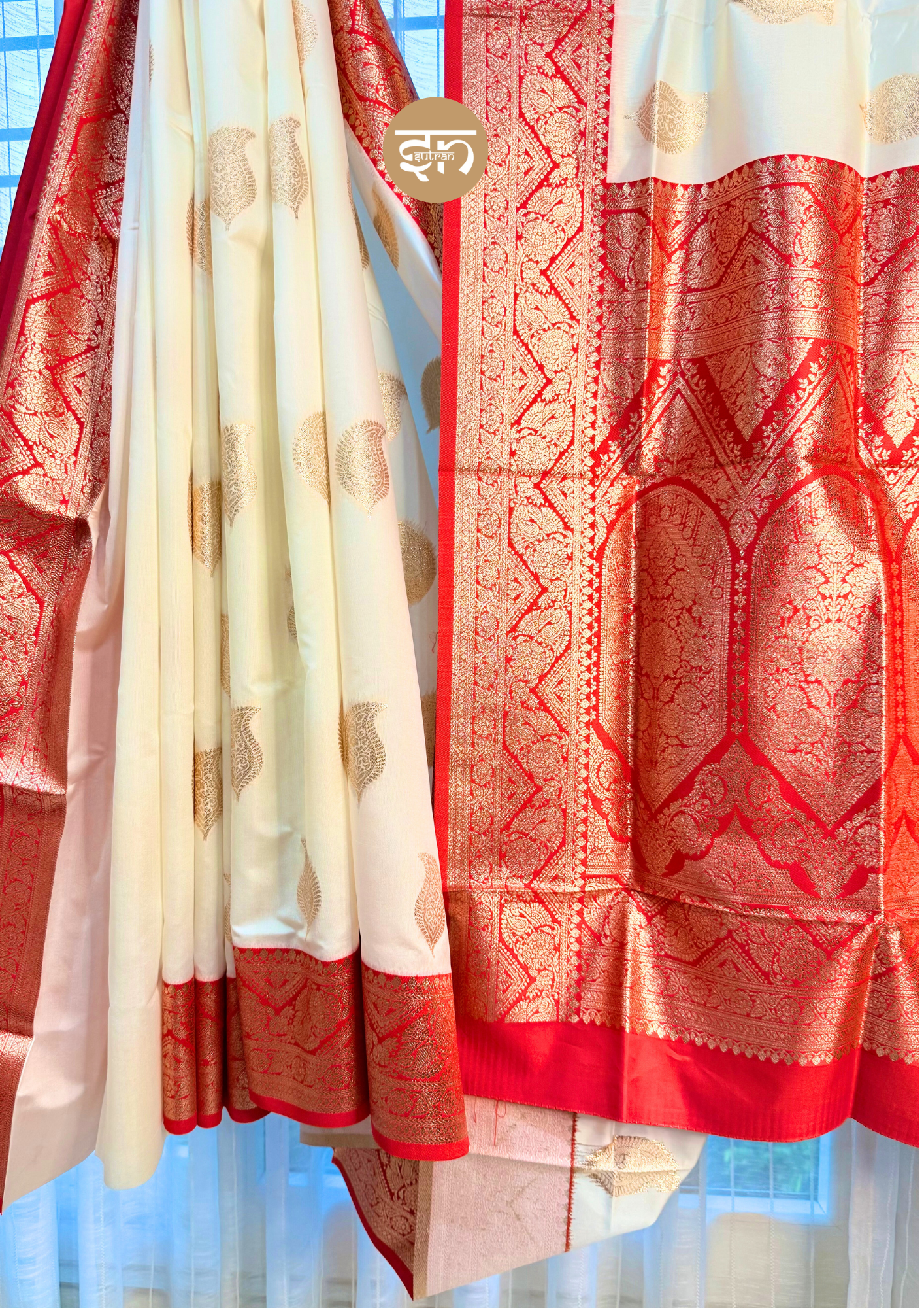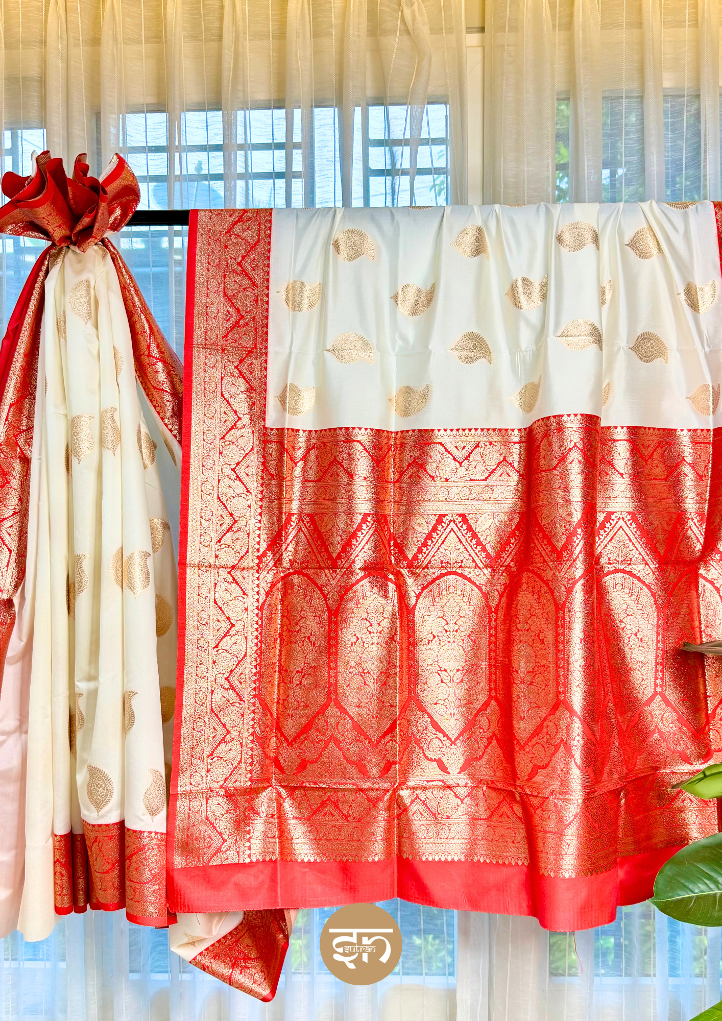 - The Swarnaabir Saree is an exquisite piece from the Katan Collection, crafted from soft, lustrous Katan fabric, ensuring it is smooth, graceful, and exceptionally comfortable to wear. The main body of the saree carries a serene, pristine white elegance, providing a beautiful backdrop for the festive detailing. The striking element is the rich red border, which is elegantly woven with brilliant golden zari, immediately adding a touch of festive grandeur. The magnificent pallu is the focal point, designed in a deep red shade and heavily adorned with detailed golden zari work, which creates a luxurious and regal finish. Draping with ease, this piece beautifully radiates tradition with an inherent sense of confidence and grace. It is perfectly suited for the most important ceremonial and festive occasions. It is an ideal choice for Durga Puja, Bijoya Dashami, or grand festive gatherings where you wish to make a sophisticated traditional statement. This is a timeless garment that truly feels like celebration woven in silk, guaranteeing you leave a lasting and unforgettable impression.